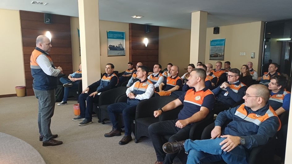 Em uma sala de auditório, um homem em pé, vestindo colete da Defesa Civil, fala para um grupo de pessoas sentadas em poltronas pretas. Os participantes, também uniformizados com camisetas azul-marinho e laranja da Defesa Civil, acompanham...