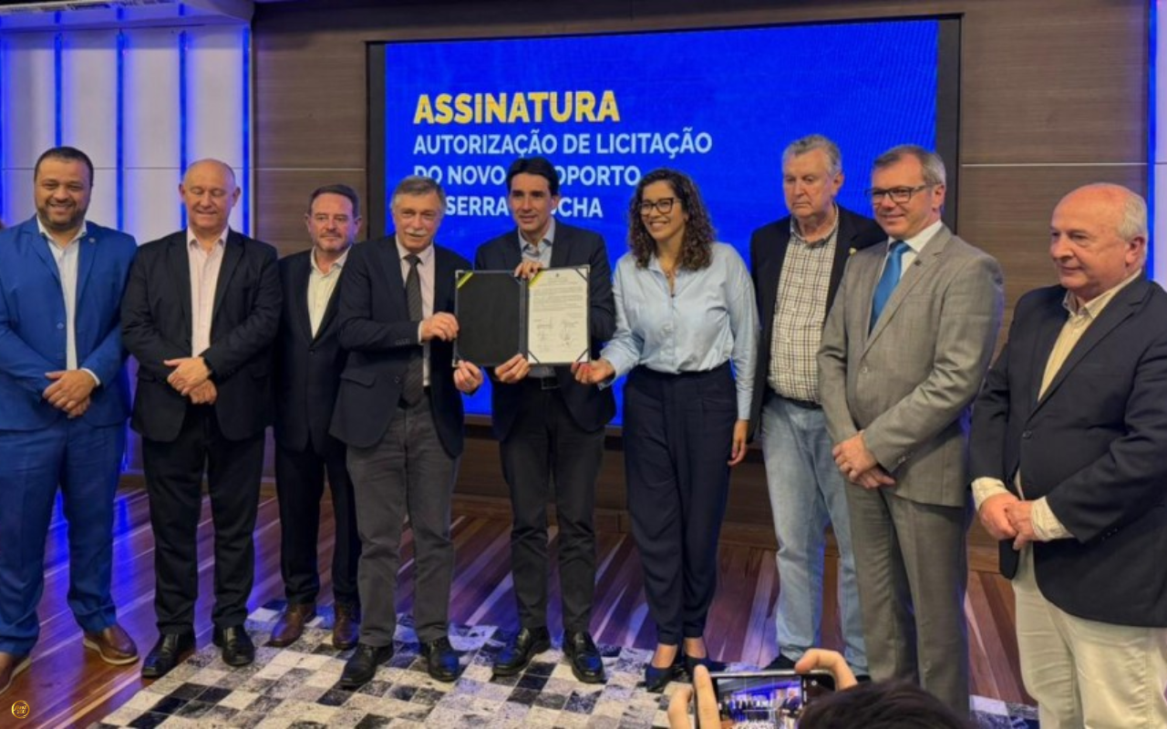 Na imagem, um grupo de nove pessoas posa para foto durante cerimônia de assinatura de autorização da licitação do novo Aeroporto da Serra Gaúcha. Ao centro, dois homens seguram o documento assinado. Atrás deles,...