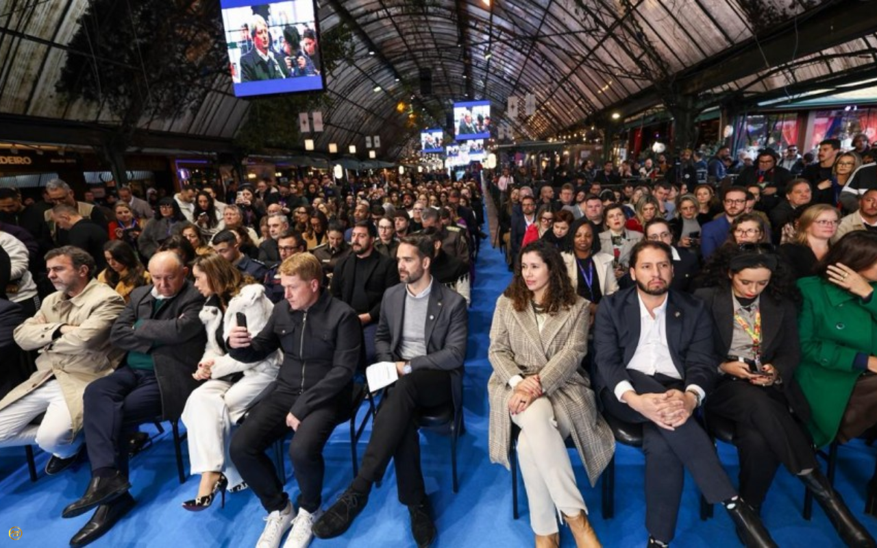 A fotografia mostra uma plateia sentada em cadeiras pretas em um grande salão com teto de metal escuro e decoração de plantas e luzes suspensas. As cadeiras estão dispostas em fileiras, e o público está olhando para a...